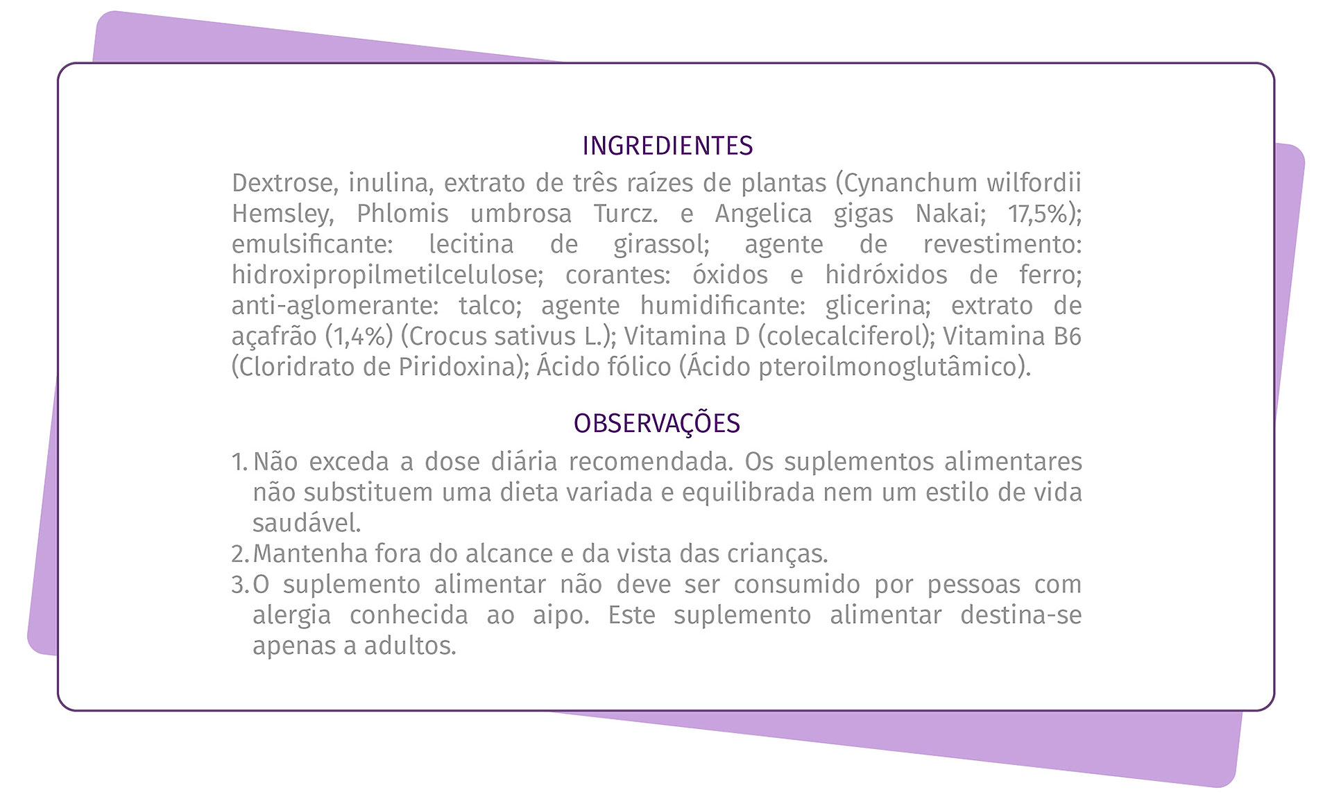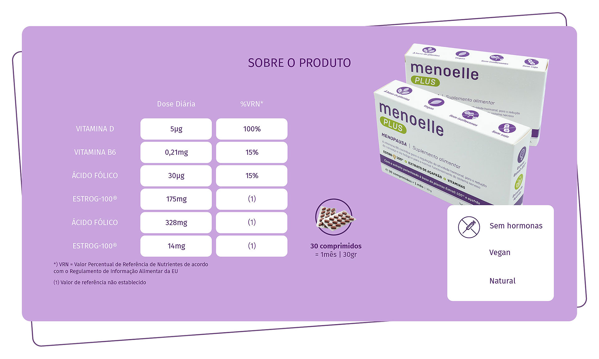 Um suplemento alimentar inovador que combina uma abordagem holística de EstroG-100©, para os sintomas típicos da menopausa, com o suporte adicional do Affron®, um extrato de açafrão altamente concentrado e clinicamente estudado que contribui para equilíbrio emocional, promovendo o relaxamento e uma melhor qualidade do sono.